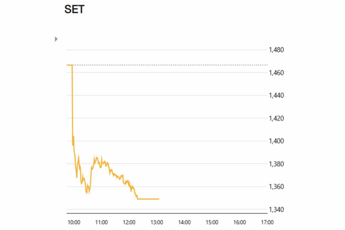 タイ証券取引所によると、午後12時18分の時点でSET指数は117.52ポイント下落し、1348.99ポイントとなりました。この急落を受け、SET、中堅企業向け市場のmai、そしてタイ先物取引所の3市場すべてで30分間の取引停止措置が実施され、午後2時30分の取引再開を予定しています。